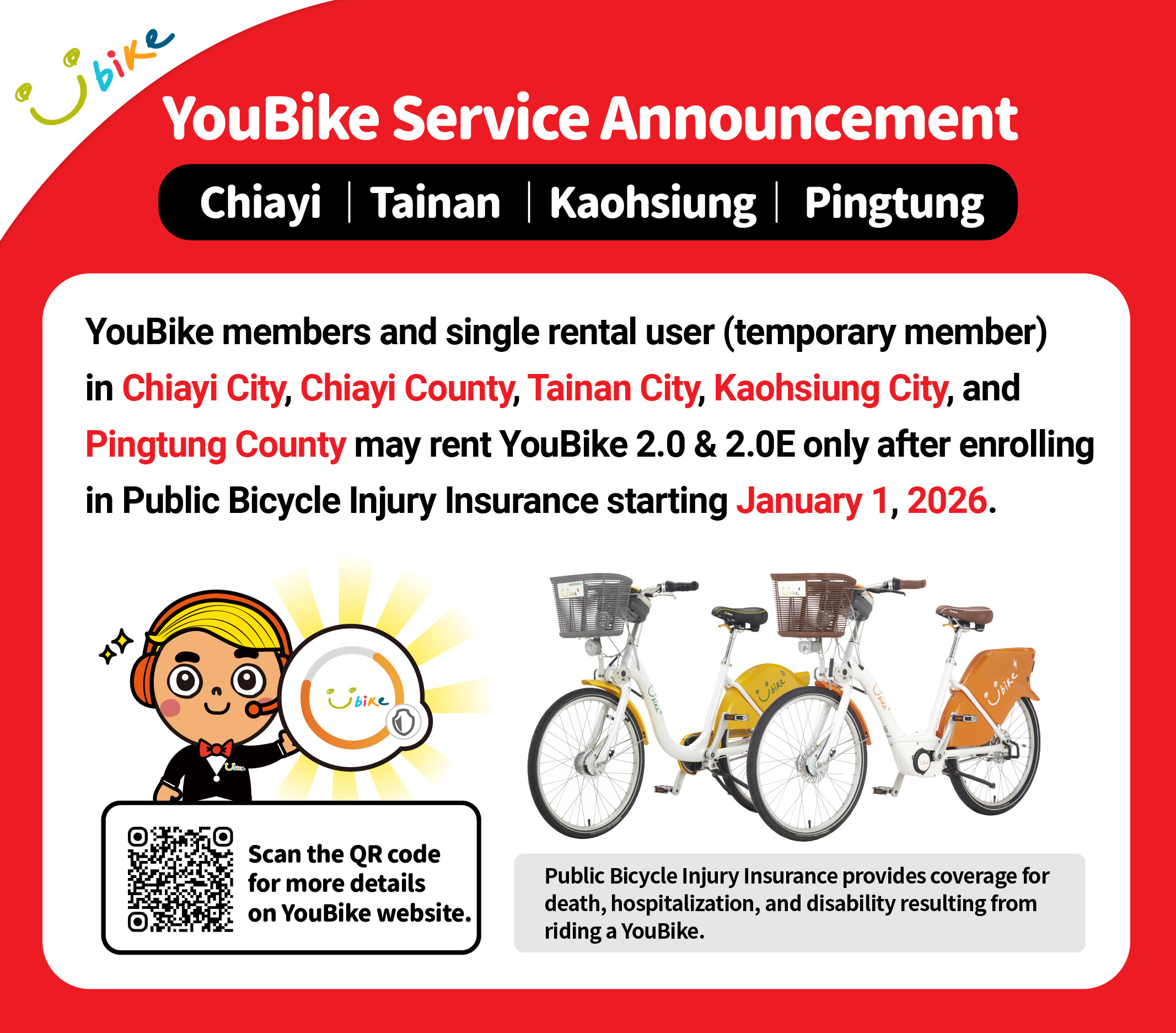 As of January 1, 2026, YouBike members and single rental user (temporary member) in Chiayi City, Chiayi County, Tainan City, Kaohsiung City, and Pingtung County should enroll in Public Bicycle Injury Insurance for YouBike 2.0 & 2.0E.