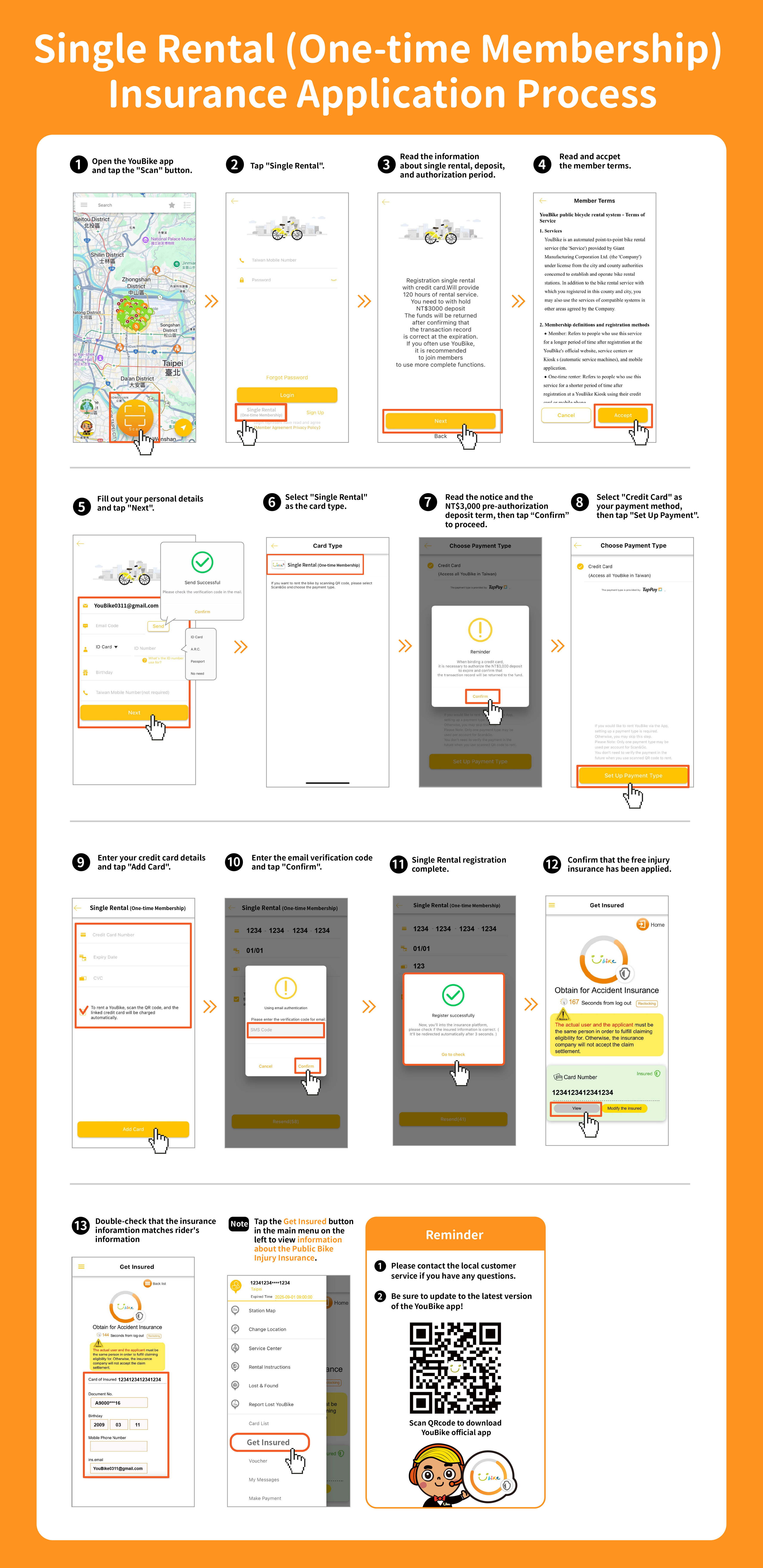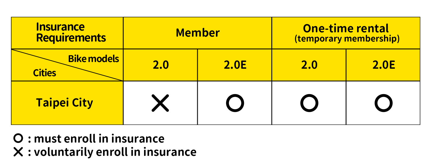 A: Without the insurance, one-time rental users in Taipei can't rent YouBike (both YouBike 2.0 & 2.0E)