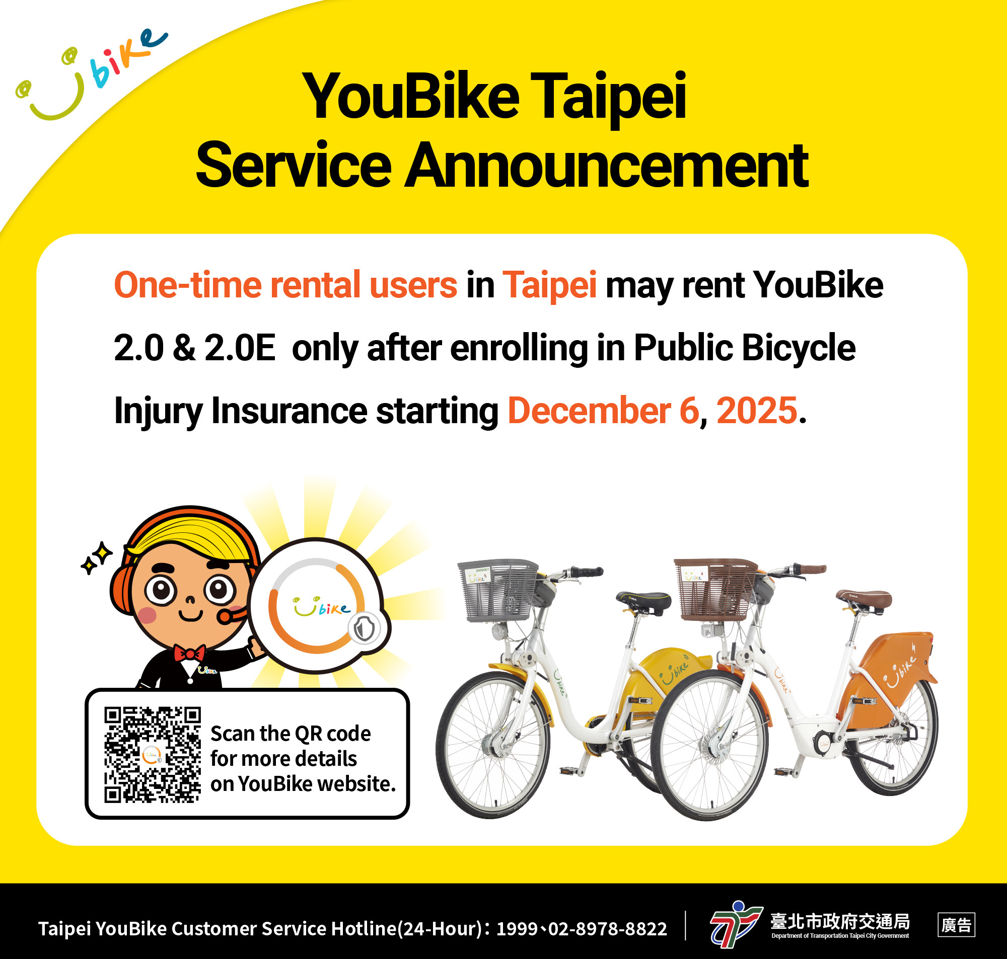 As of December 6, 2025, one-time rental users in Taipei should enroll in Public Bicycle Injury Insurance for YouBike 2.0 & 2.0E.